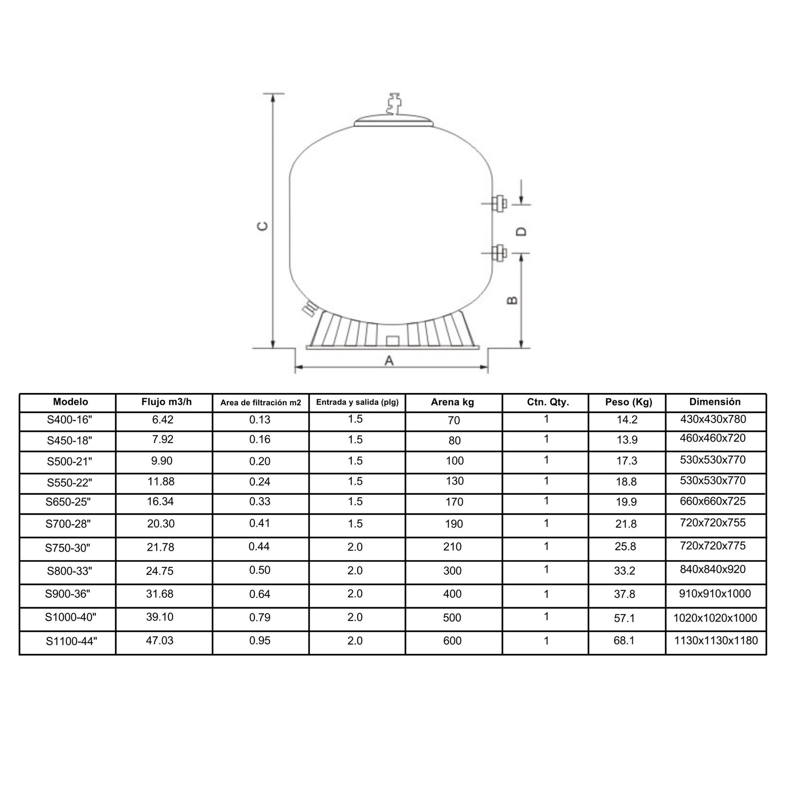 • El filtro de arena está equipado con un manómetro, tapón de drenaje y válvula de desahogo.